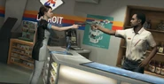 The other possible option is playable only if Kara has Todd's gun. With it, she can threat Nathan, and demand money. If this option is chosen, another person will walk into the store to buy some drinks. Kara can either leave then and escape or stay where she is. If the player chooses to stay, the other person will finish and leave, and Kara will continue to demand cash. Kara can order him to: Back off!, Turn Around! or Bills! If you choose "Bills", Nathan will grab a hidden pistol in the cash register. Kara can either give up or convince him why she needs the money. If convinced, he will let her have the money, and he will not call the police.